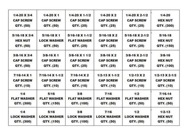Create a workspace that is organized and offers everything you need.  This 40 Hole Bin Kit is made of durable steel and includes 3765 pieces of the most popular sizes in Grade 5 USS Coarse Thread Hex Cap Screws, Nuts, and Washers.  Fasteners in this kit are exclusively USA Made.