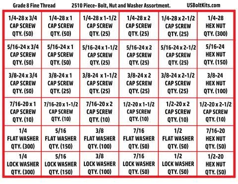 Keep Organized! This 40 Hole Bin Kit is made of durable steel and includes 2510 pieces of the most popular sizes in Grade 8 SAE Fine Thread Yellow Zinc Plated Hex Cap Screws, Nuts, and Washers.