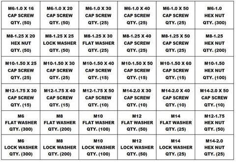 Keep Organized! This 40 Hole Bin Kit is made of durable steel and includes 2540 pieces of the most popular sizes in Metric 10.9 Coarse Thread Zinc Plated Hex Cap Screws, Nuts, and Washers.