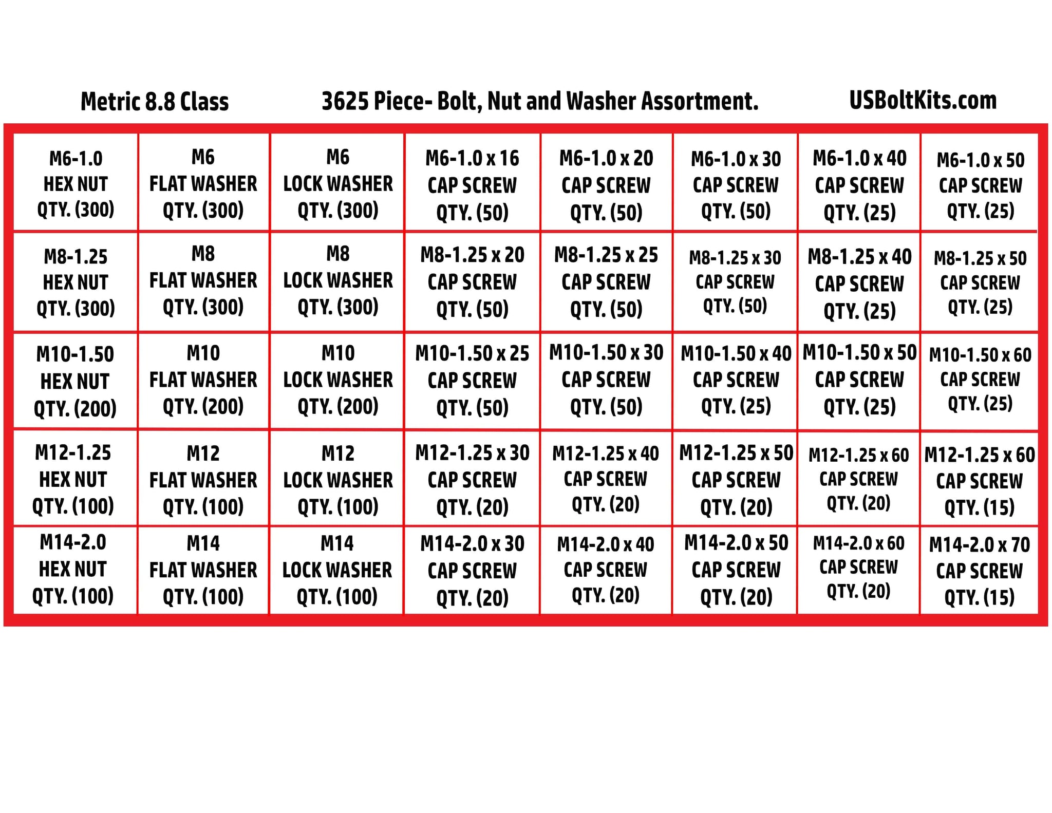 Create a workspace that is organized and offers everything you need. This 40 Hole Bin Kit is made of durable steel and includes 3625 pieces of the most popular sizes in Metric 8.8 Coarse Thread Hex Cap Screws, Nuts, and Washers.