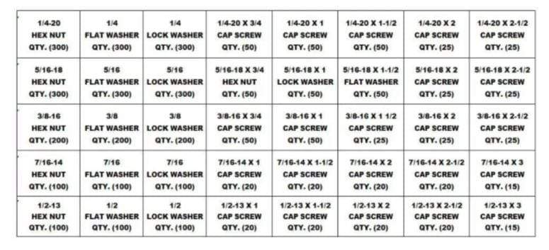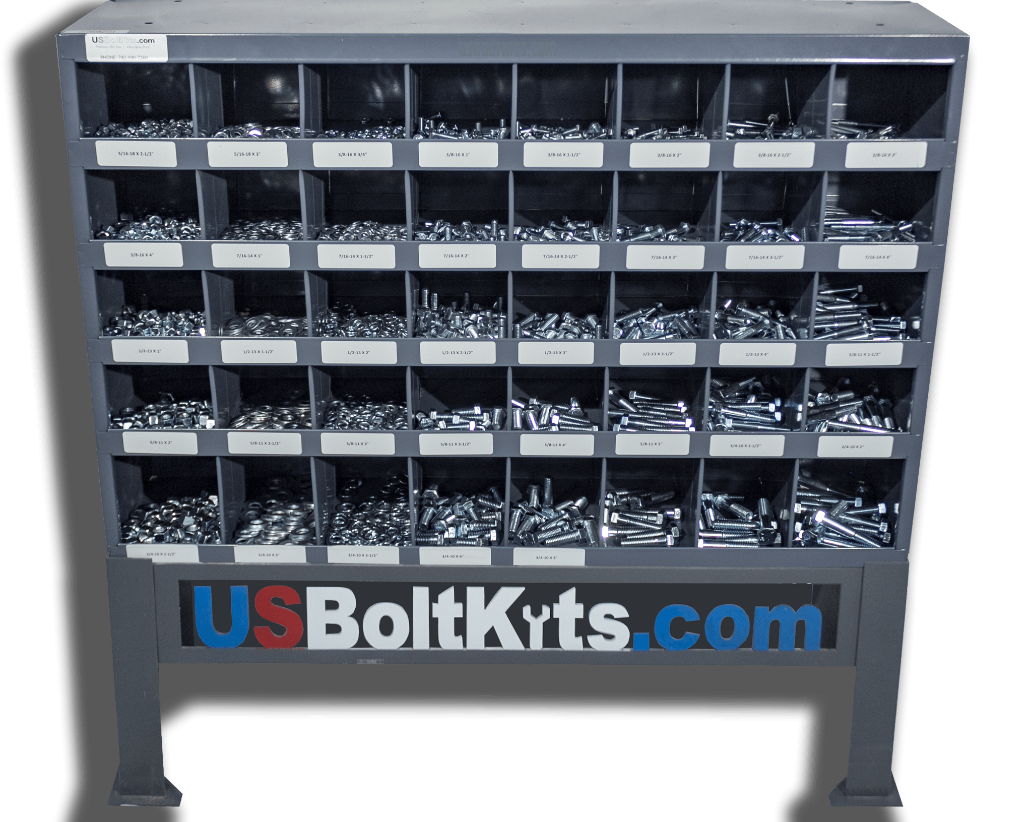 Create a workspace that is organized and offers everything you need. This 40 Hole Bin Kit is made of durable steel and includes 3765 pieces of the most popular sizes in Grade 5 USS Coarse Thread Hex Cap Screws, Nuts, and Washers.