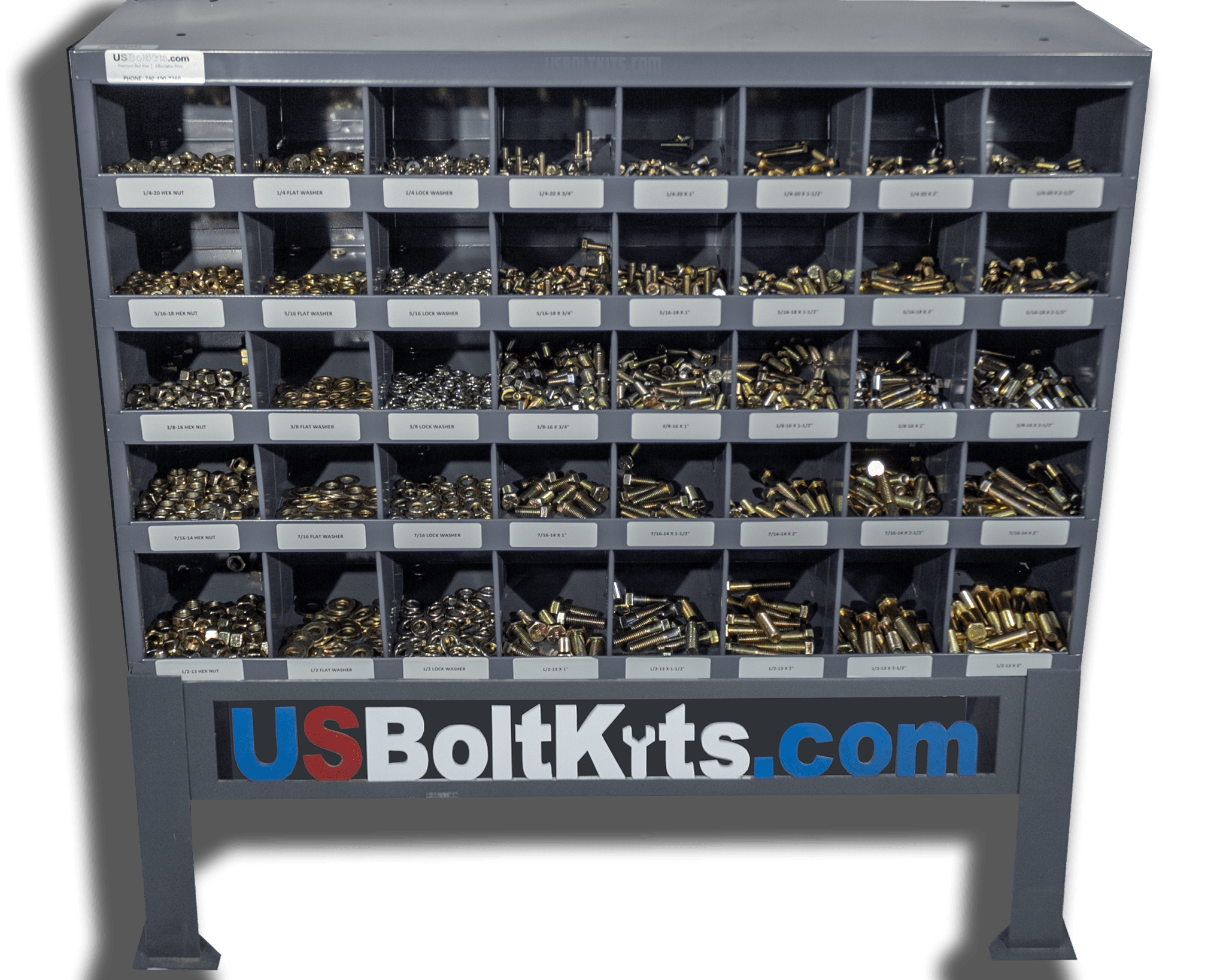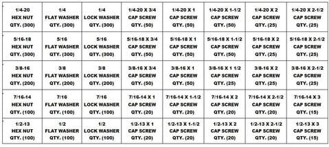 Create a workspace that is organized and offers everything you need. This 40 Hole Bin Kit is made of durable steel and includes 3765 pieces of the most popular sizes in Grade 8 USS Coarse Thread Yellow Zinc Plated Hex Cap Screws, Nuts, and Washers.
