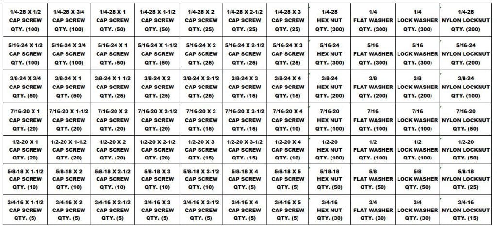 • All of the most common fastener sizes in 1/4, 5/16, 3/8, 7/16, 1/2, 5/8, and 3/4. This kit includes the best proportional of bolts to nuts/washers for the money.