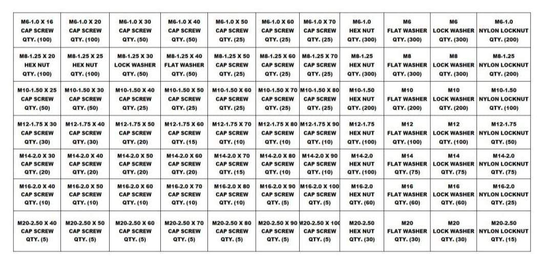 Mega storage and organization! This Two 40 Hole Bin Kit is made of durable steel and includes 5135 pieces of the most popular sizes in Metric 8.8 Coarse Thread Zinc Plated Hex Cap Screws, Nuts, Lock Nuts and Washers.