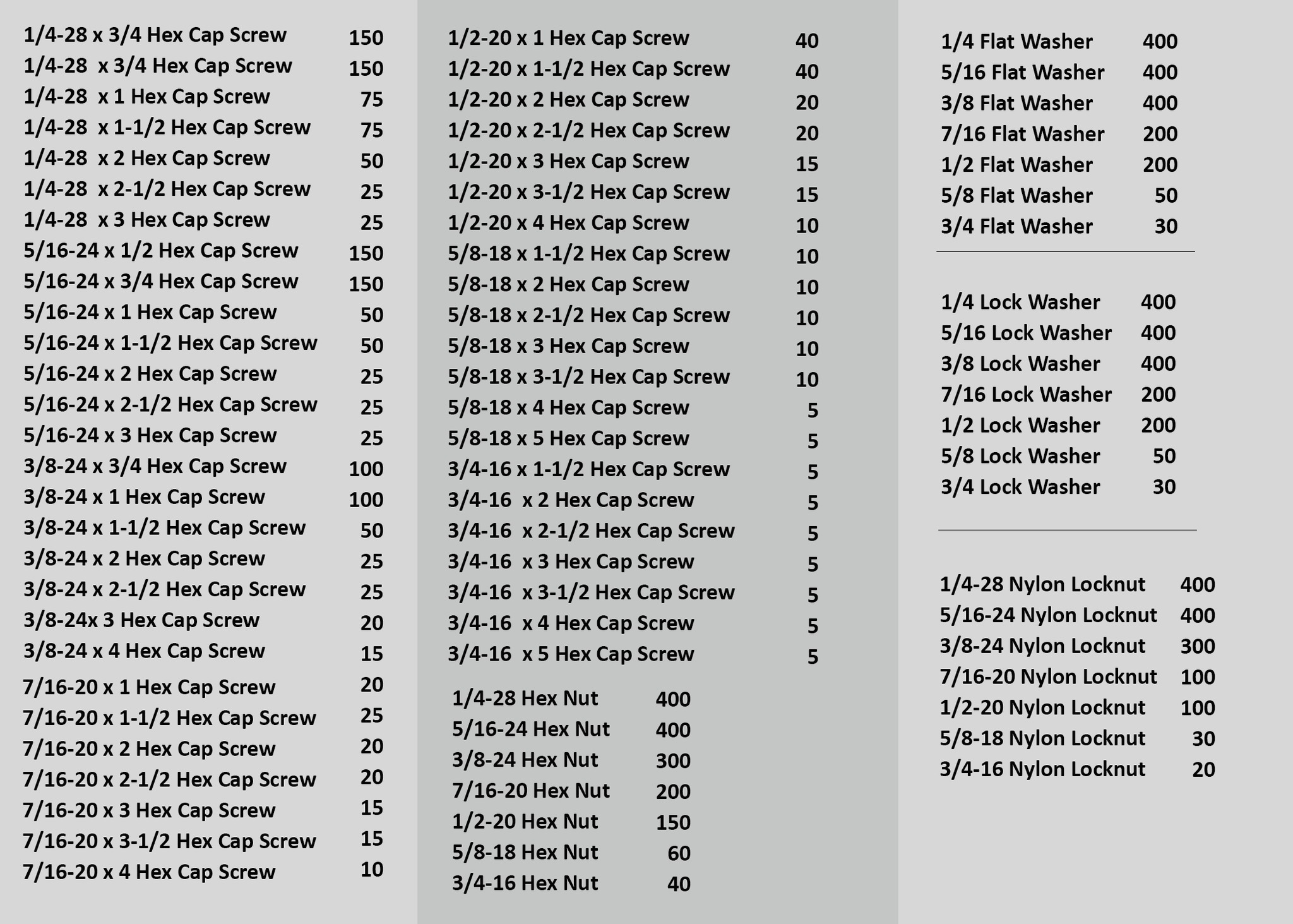 - All of the most common fastener sizes in 1/4, 5/16, 3/8, 7/16, 1/2, 5/8, and 3/4. This kit includes the best proportional of bolts to nuts/washers for the money.