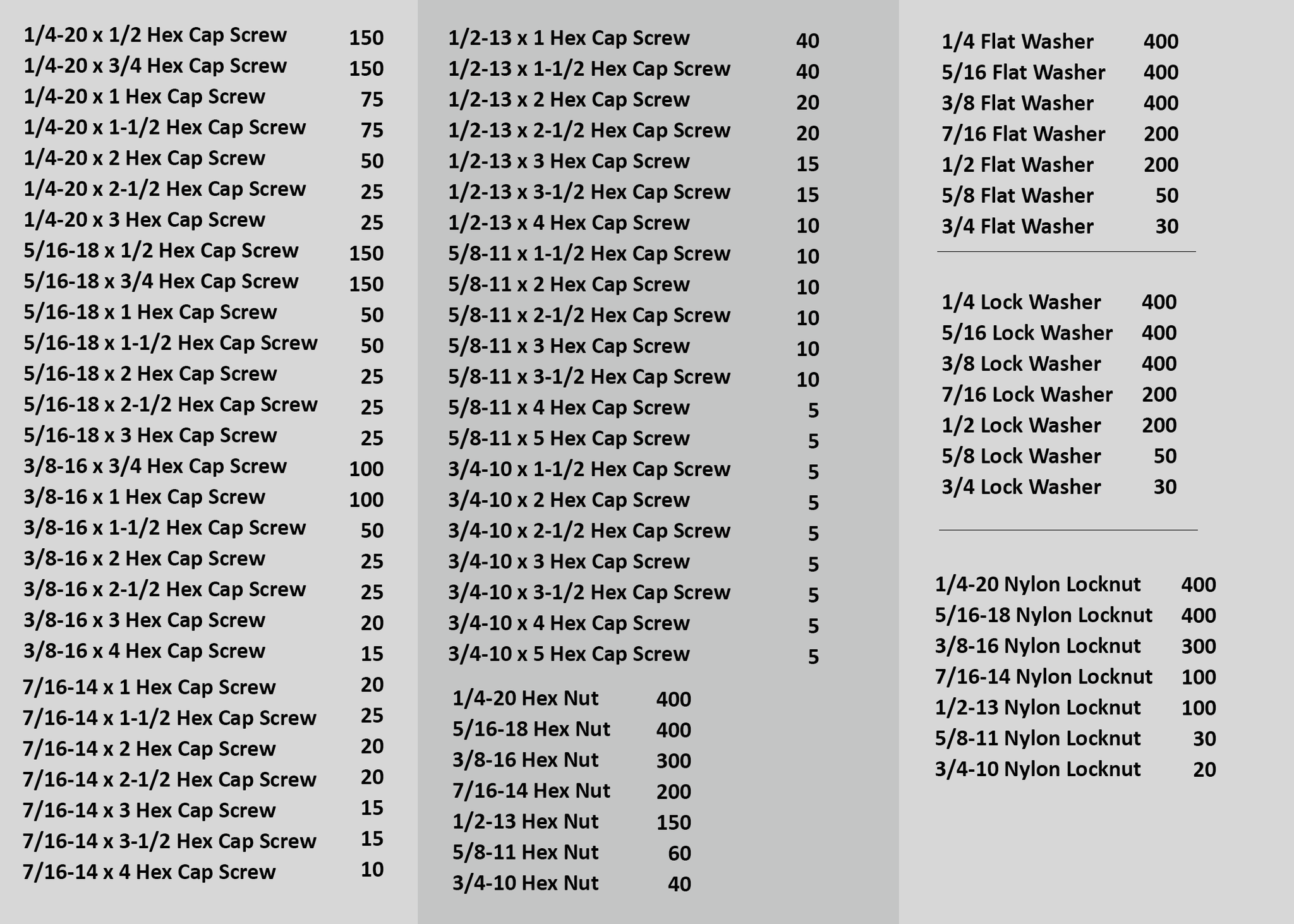 - All of the most common fastener sizes in 1/4, 5/16, 3/8, 7/16, 1/2, 5/8, and 3/4. This kit includes the best proportional of bolts to nuts/washers for the money.